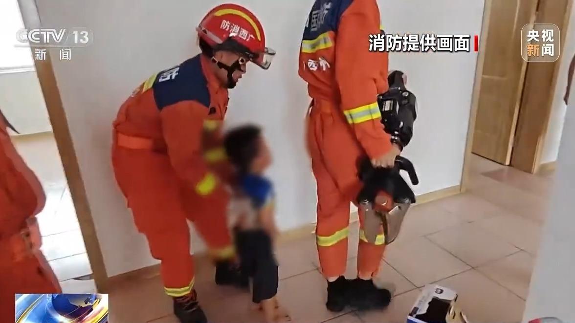 消防人员赶到孩子家中看到,孩子被卡在防盗窗护栏中,派出所民警正双手抓着孩子身体,防止他下坠。消防员见状赶忙将救援绳索系在孩子身上,把阳台玻璃窗及纱窗拆下,扩大救援空间。最终,孩子安全脱险。